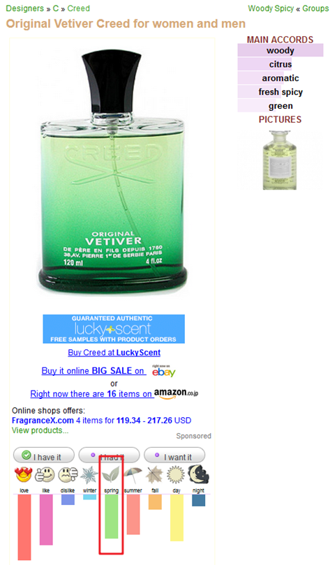 春らしい香りを選ぶ際、当然デパートなどで実際に試香するのが一番ですが、fragranticaなど、データベースで当たりをつけていくと良いと思います(英語サイトです。残念ながら、この手の日本語サイトあまりありません)。