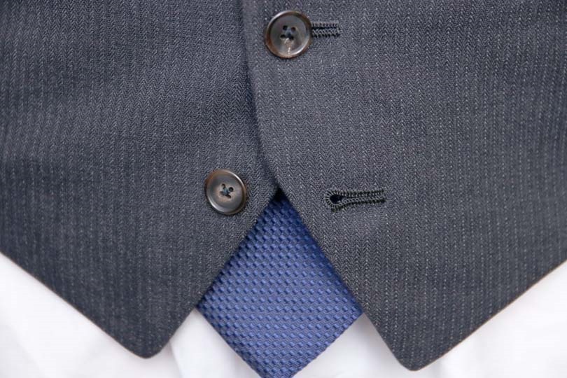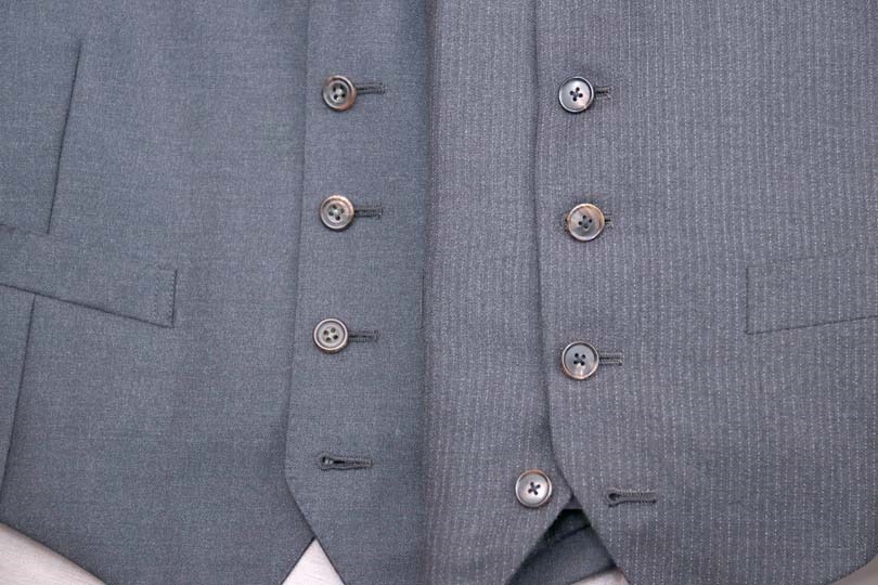 なお、ウェストコートの中には、初めからボタンが掛けられないようになっている(飾りボタンになっている)物もあります(写真右のウェストコート)。