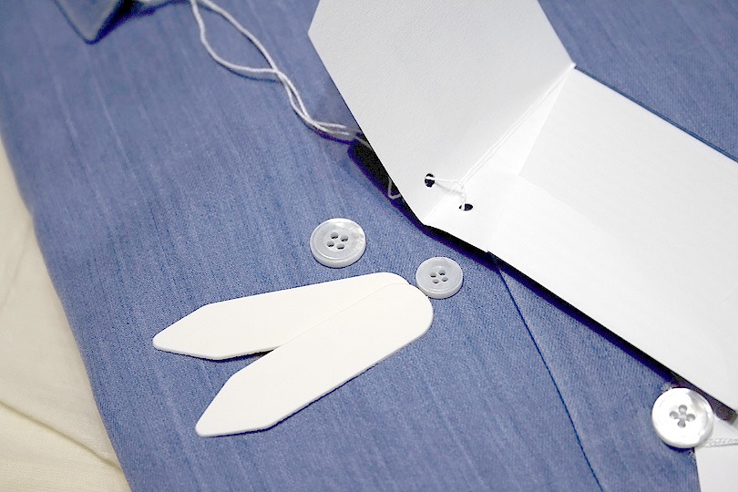 いつも通り、替えボタンは裾縫い付けではなく、高級シャツと同じく予備のカラーステイ(カラーキーパー)と一緒に、袋に入っています。