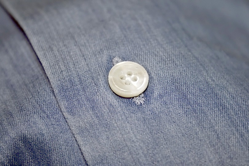 前立てのボタン。写真では見えませんが、頑丈に縫い付けられている上に、わざわざ樹脂で縫い糸を固めており、強度が大幅にアップしています。海外のシャツでは殆ど見ない仕様で、過剰品質とも言えそうですが、私はこういった細かい気配りを高く評価したいと思います。
