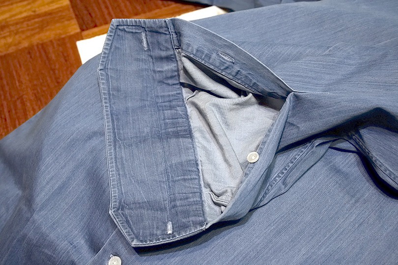 まずは襟元です。従来のデニムシャツにありがちな「クタッ」とした印象が全くありません。