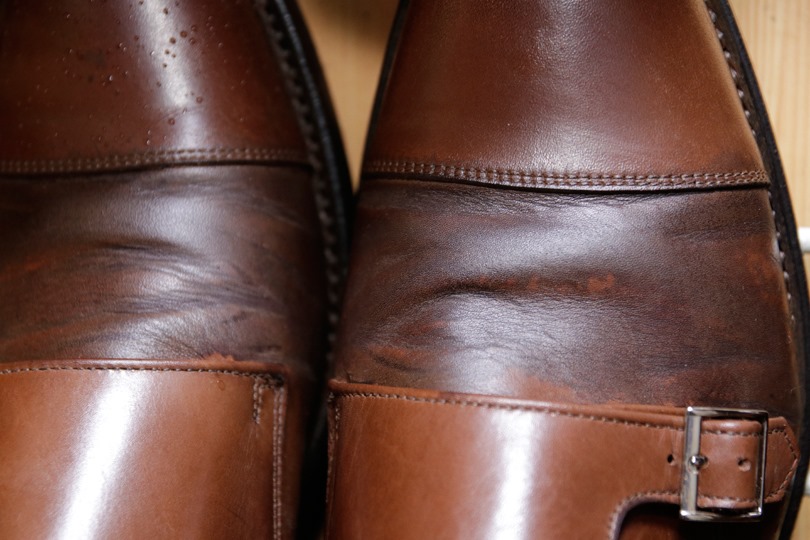 雨に濡れる恐れがある場合は、顔料系クリームを使った上で、水を使って軽くポリッシュ(靴クリームを厚塗りせず、鏡面磨きと同じ要領で水を使って磨く)し、表面を薄くロウ分でコーティングしておくとよいでしょう。