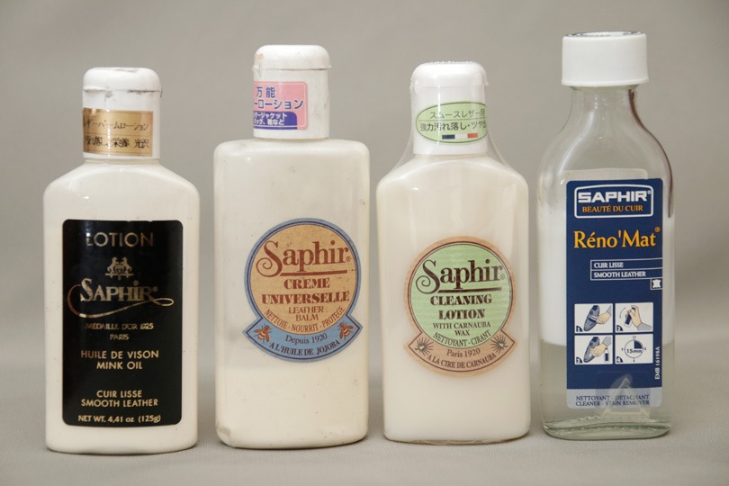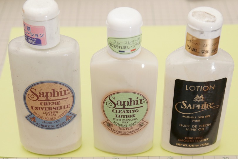 サフィール関連で私が使っているのは、左からレザーバームローション、ユニバーサルレザーローション、クリーニングローション(今回購入)、レノマットリムーバーです。