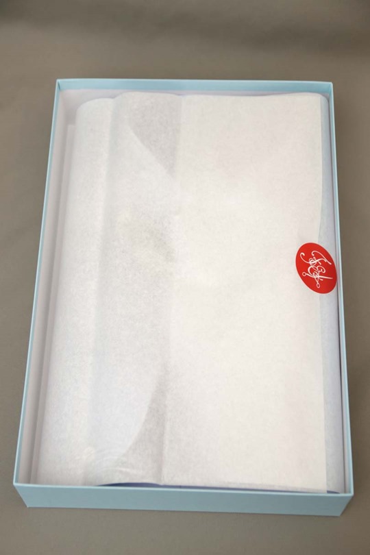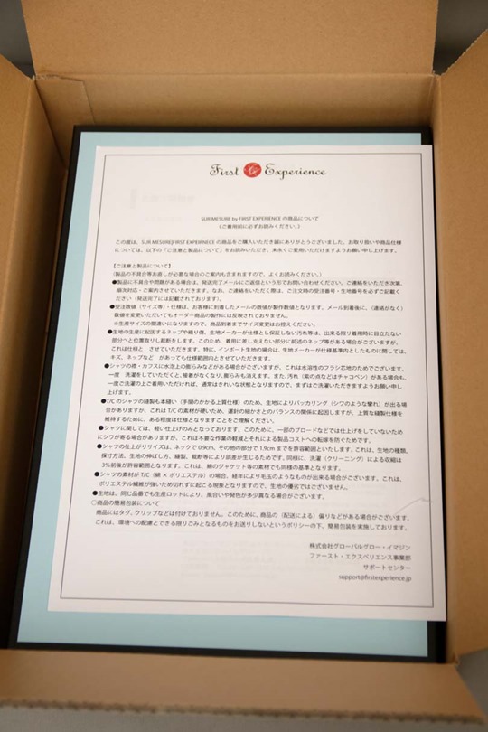 この箱、自分用として注文するときには余計な感じがします。(着用者のヌード寸が必要なオーダーシャツ、それもネット通販のものを贈答として使うシーンは、かなり稀なのではないでしょうか。)