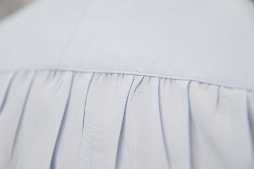 外側から見るとこんな感じ。少しフェミニンな感じになるため好みは分かれるかも知れませんし、アイロンがけに難儀しそうですが、柔らかい生地ではそのふんわりとした雰囲気が良く出ると思います。
