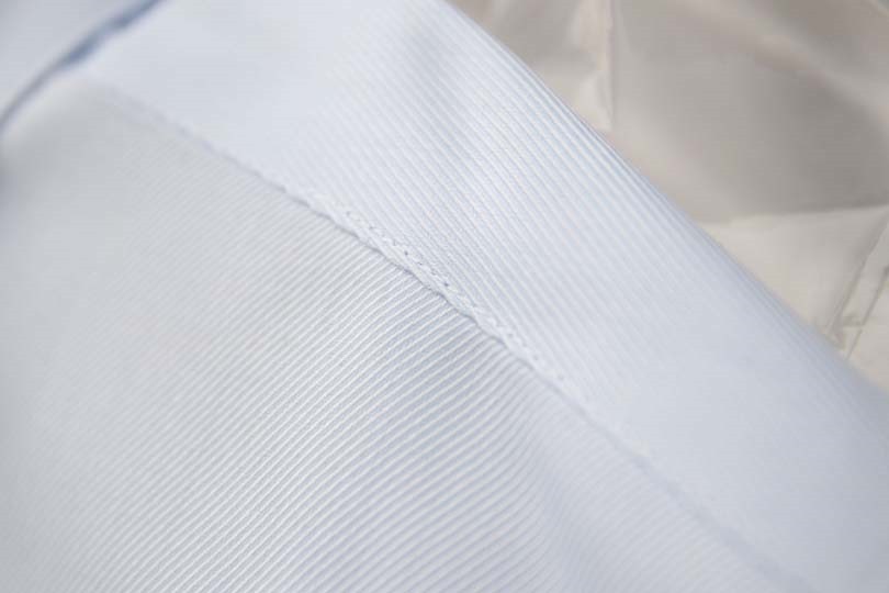こちらは以前同じシリーズ(トーマスメイソンのゴールドライン140/2)のツイル生地を、プレミアムラインで仕立てたものです。比べると縫い目が目立ちます。
