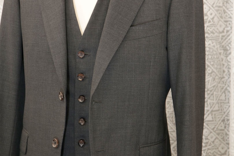 三つ揃いは、前を開けて着ることができるため、内ポケットに物をいれても目立ちにくいからです。