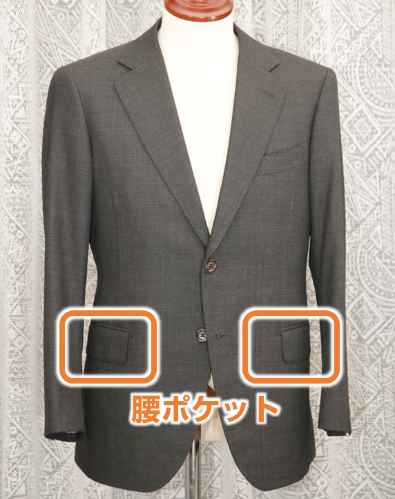 したがって、この腰ポケットがあるために、ジャケットの着丈(縦の長さ)を大きく詰める事が難しくなります(詰めるとバランスが悪くなる)。