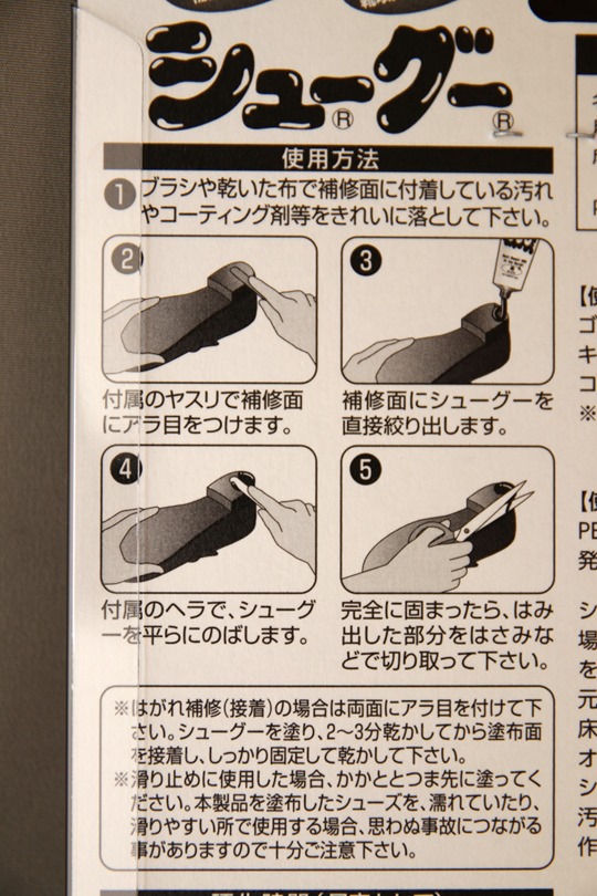 使い方は、ヤスリで靴底に傷をつけ接着しやすくした上で、修理剤を塗布・成形し、乾燥硬化させるというもの。