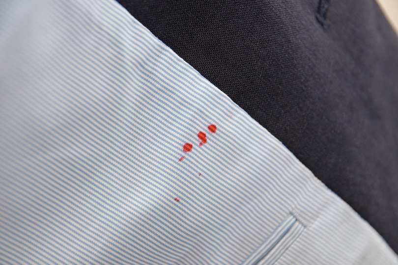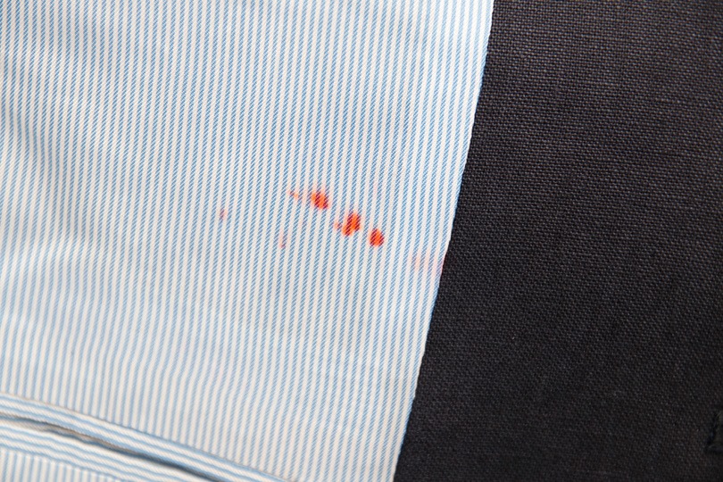ジャケットの内ポケット下にも赤いボールペン(サインペンかな……)のシミが。