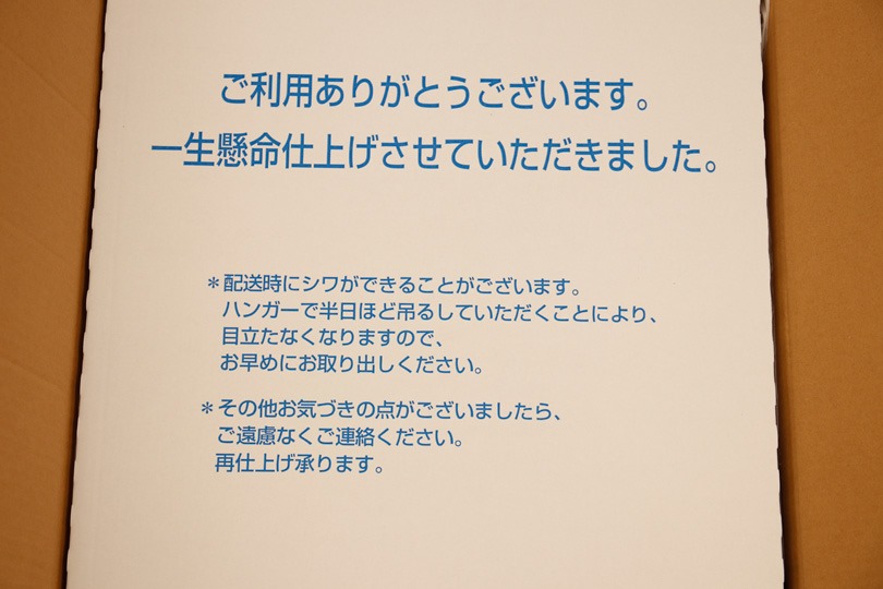 梱包の仕組みが洗練されていて、保管クリーニングにありがちな輸送時のジワがあまりついていませんでした。