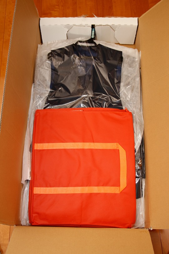 中身は書類一式と、洗濯物を入れる不織布で出来たオレンジ色の巨大バッグです。