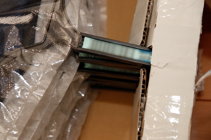 ハンガーが段ボール箱にはまるようになっています。輸送中に服が偏るのを防ぐ仕組みですね。