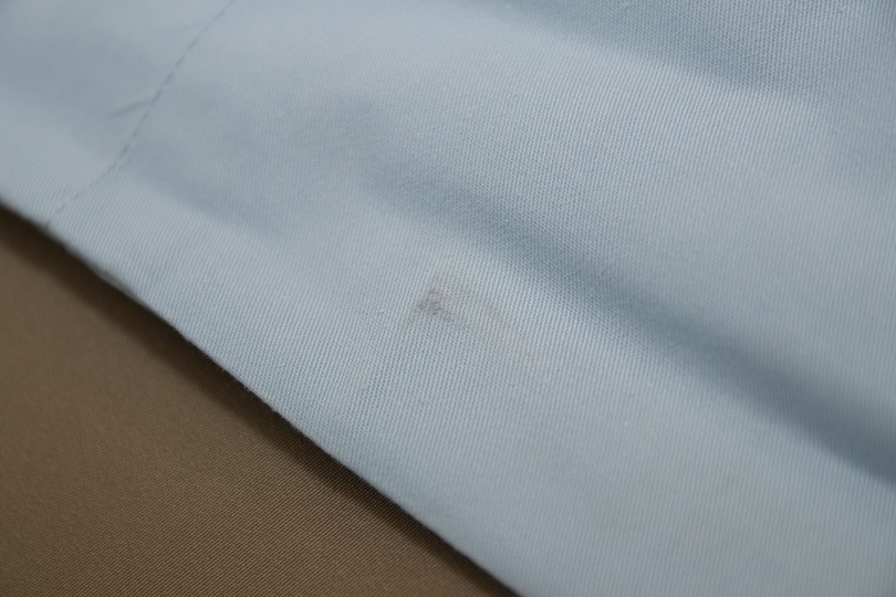 (業者の視点に立つと……シミ抜きは、色素を透過・吸引するように行いますが、この位置の裏側はジャケットの表地であるため、作業が難しいのだと思います。)