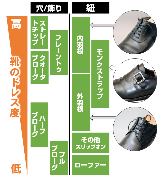 靴のドレス度は概ね上の図の通りです(異論は沢山ありましょうが、とりあえず仮置きで……。)。