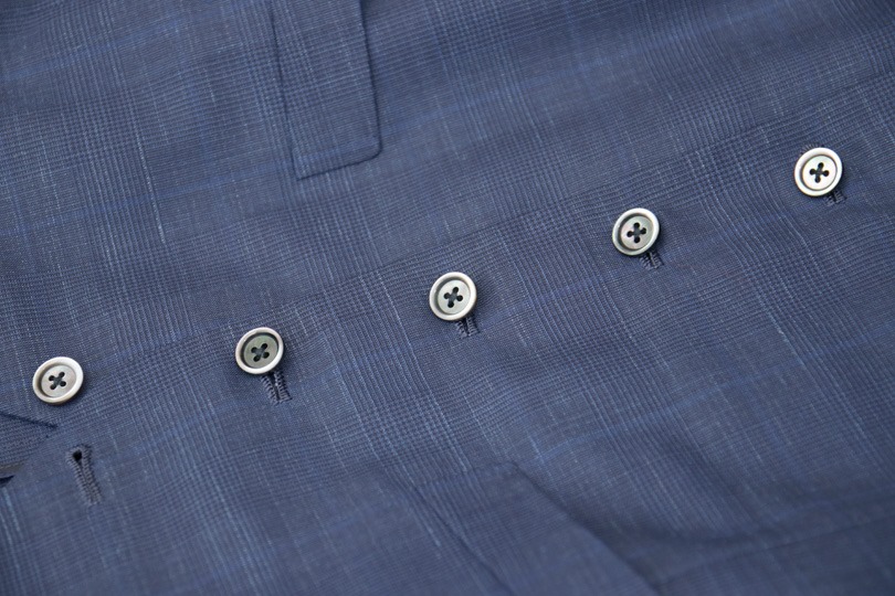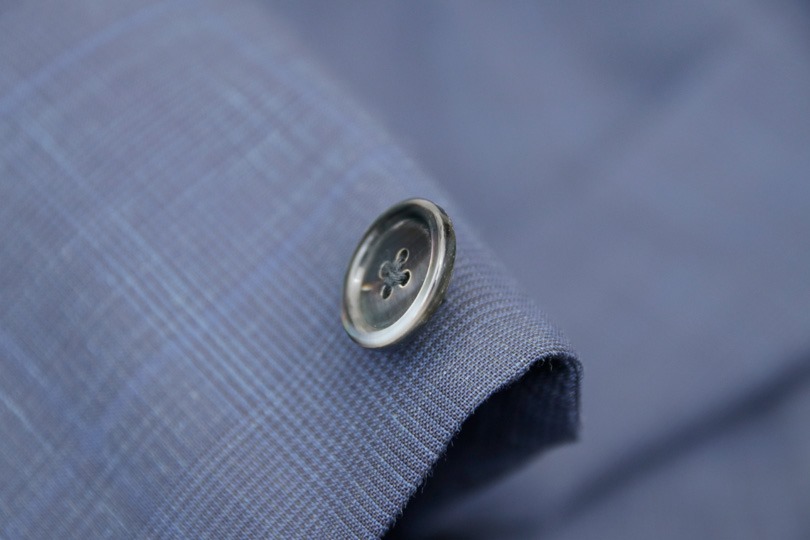 ジャケットも同様で、フロントボタンと袖のボタンは生地の見栄え大きく左右します。そして、フェイクの(プラ製の)ボタンよりも、本物の貝ボタンの方が段違いに高級感が出ます。