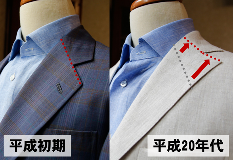 平成の初期にはかなり下がっていたゴージラインは、今から5年~10年位前はかなり高く(地面と平行に近い状態。いわゆるハイゴージ)なり、そして昨今では再び揺り戻しが来ているようです。