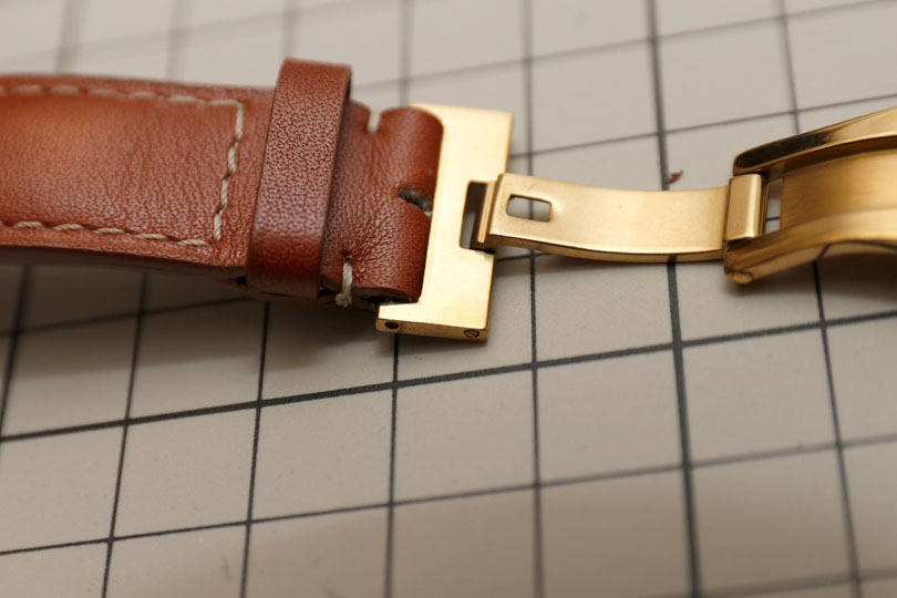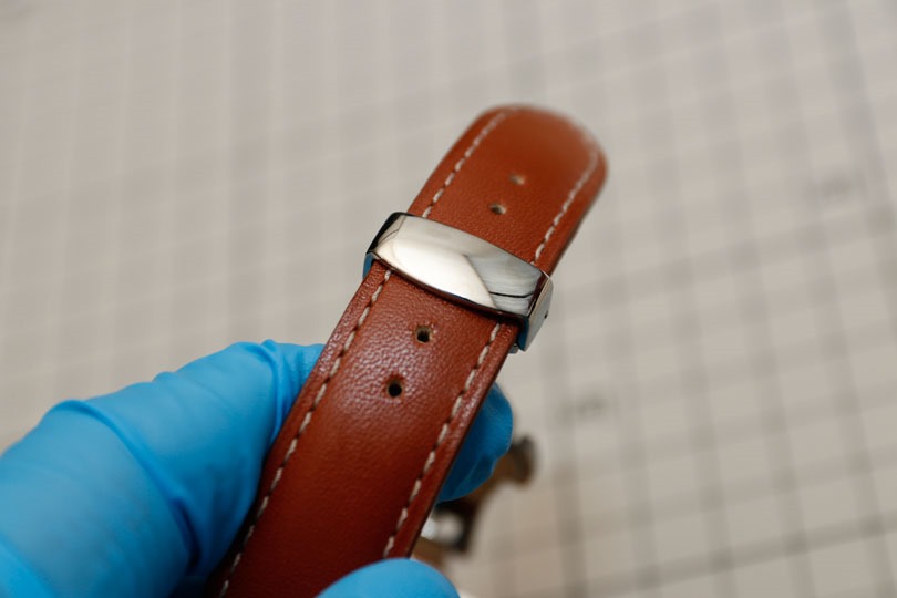 構造上、腕時計を留めたり外したりする作業は片手で行わざるを得ませんが、普通の革ベルトはすこし手が滑っただけで時計が地面に落下します。