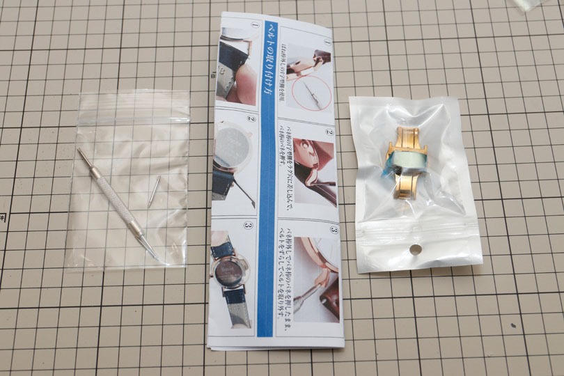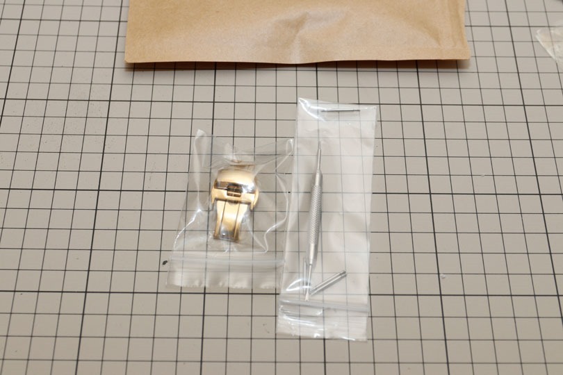 厚手のチャック付き袋に入っており、簡易なバネ棒外しとバネ棒が附属します。