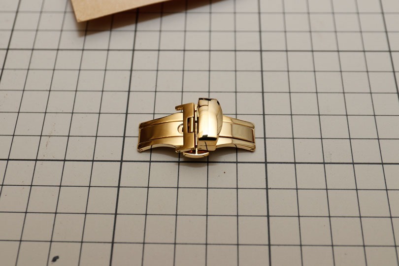 先ほどと同じ時計に取り付けました。(銀色のケースに金色のバックルは通常取り付けませんが、比較のためにご容赦下さい。)