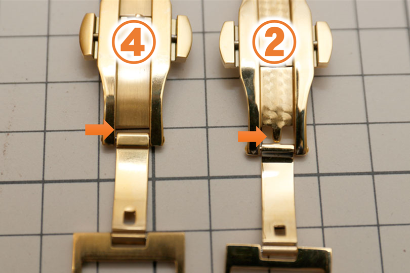 ②にはバックルの内部に少し持ち上がった突起があり、これがバネとなって留具に勢いがついて外れます。