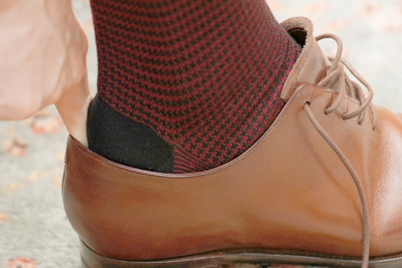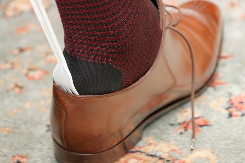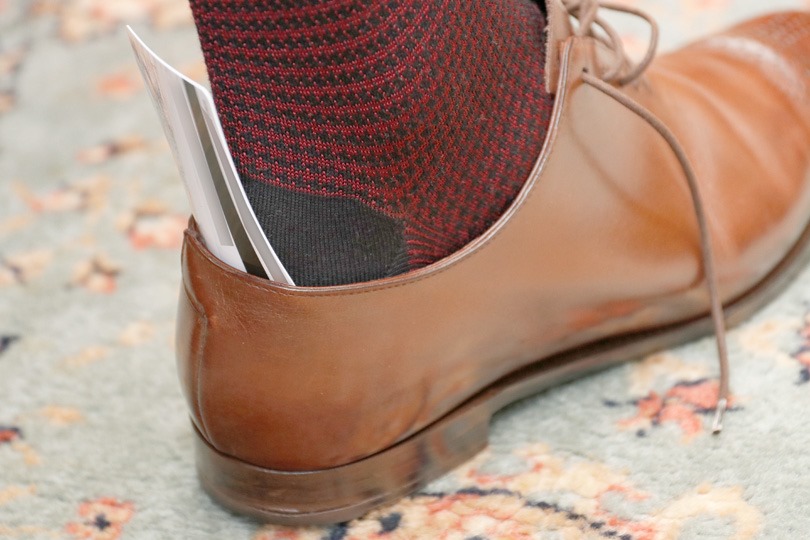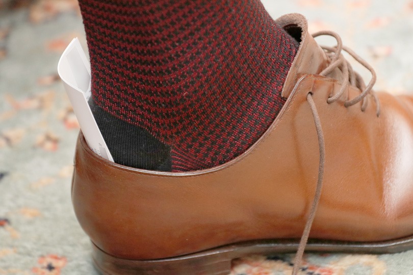 ハンカチの場合は厚いこと、また封筒の場合は封筒そのものに耐久性が無いことから、足のかかとと靴のヒールカップ部分に、普段より大きめに隙間を作る必要があります。そうすることで、上手く足入れでき、靴や足へのダメージも少なくなります。