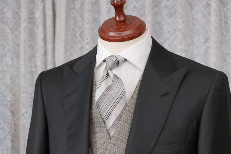 やり過ぎると嫌らしくなりますが、タイバー(いわゆるネクタイピン)を使い、ネクタイをふんわり持ち上げると立体感が出て綺麗に見えます。弔事には向きませんが、慶事であればとても華やかに見えます。