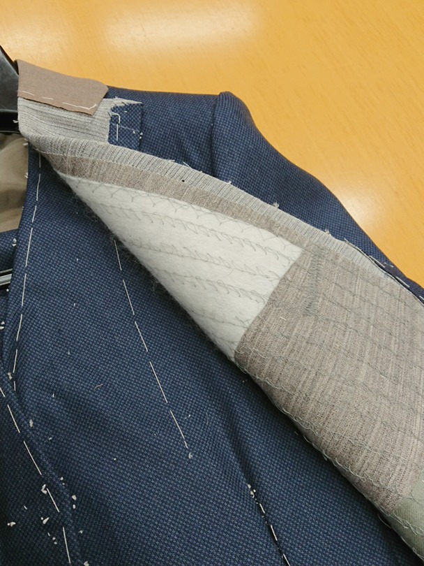芯地は、ジャケットの主に胸や襟部分に入っている副資材です。胸を構築的に見せ、襟や肩を美しく保ちます。