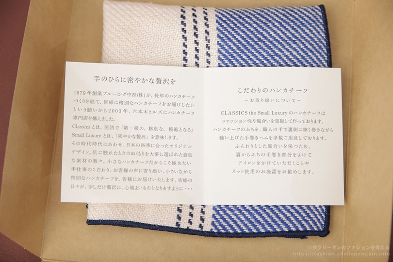 ブルーミング中西という、東京の老舗テーブルクロス/ハンカチメーカーの直営で、「クラシック・ザ・スモール・ラグジュアリー」というお店です。(ブルーミング中西は、贈答品用のアクアスキュータムやブルックスブラザースのハンカチを作っているメーカーとしても有名ですね。)