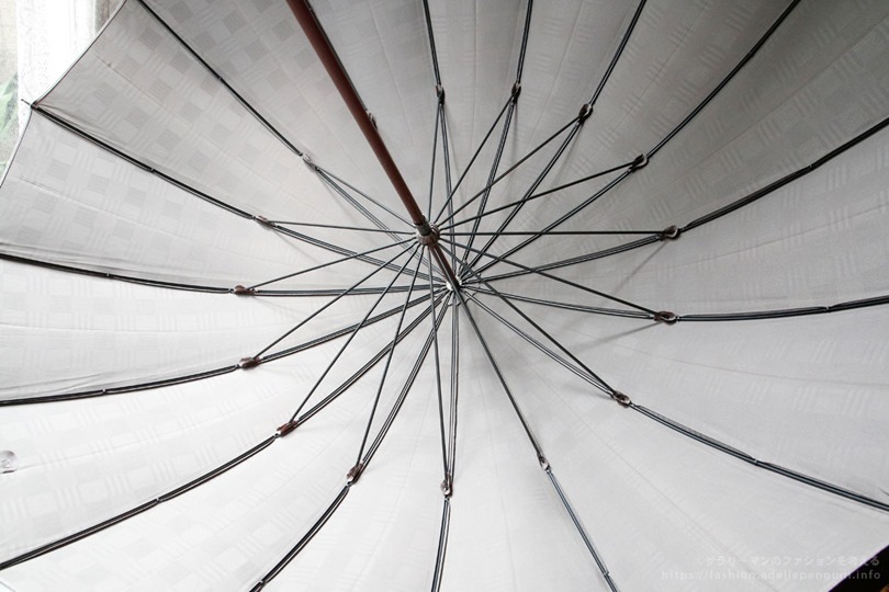 この傘は骨が16本もあり、開いたときにまるで和傘のように美しく、他の傘とは明らかに別格な雰囲気を漂わせます。