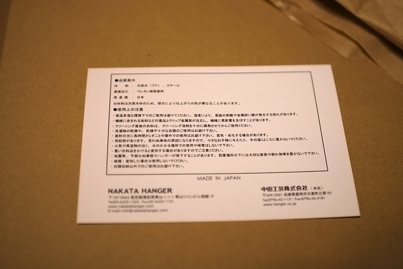 はがき大の説明書き。ハンガーの材質はブナ材です。