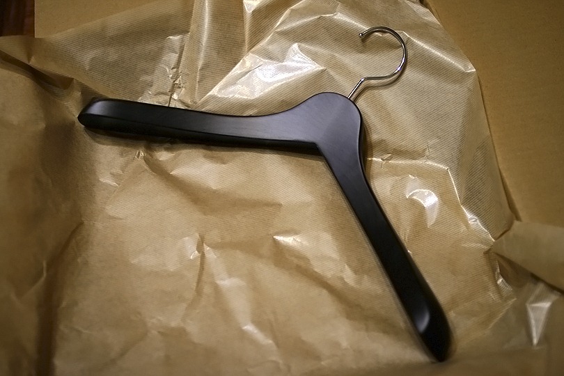 スーツを買った/作ったときについてくるハンガー、あれも店によって特徴がありますよね。しっかりとしたテーラーなどでは、今回登場したプラスチックハンガーのような大ぶりの物をサービスしてくれる場合もあります。
