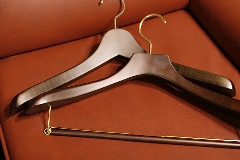 一方で、肩の厚みが殆ど無いハンガー(ツーリストハンガー)で納品する店があるのも事実です。そんなときは、ある程度の厚みのあるハンガーに掛け替えてやってください。ジャケットを着たときの、肩のフィット感がとても良くなります。