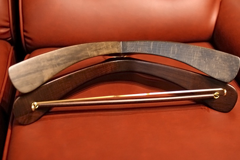 手前のトラウザーズ掛けがあるタイプがながしお製「高級木製オリジナルハンガー」、うしろがナカタハンガーです。どちらも同じような用途、見た目、価格帯に思います。