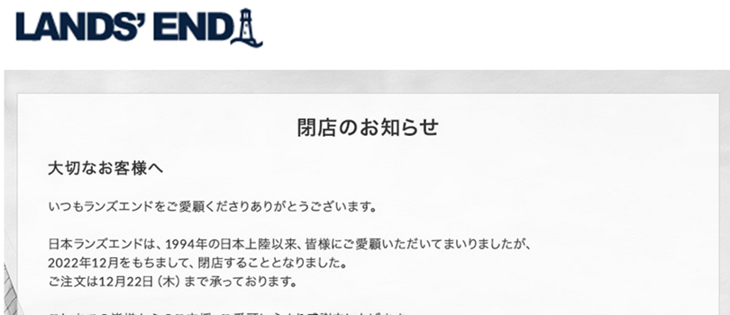 私が20年近く愛用してきたファッションECサイト「Lands’ End(ランズエンド)」が日本市場から撤退し、日本のECサイトも閉鎖すると発表したのです。
