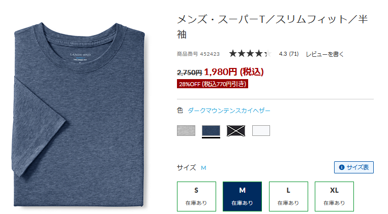 セール価格:1,980円(税込、この価格からさらに値引きされます)メンズ・スーパーT/スリムフィット半袖……細身の方はこちらの方がおすすめ。個人的にはこのシルエットが好きです。