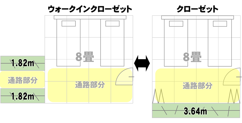 通常のクローゼットは、通路部分が居室と共用のため、無駄はありません。しかし、ウォークインクローゼットにすると、どうしても「ウォークイン部分」専用の無駄が出るのです。