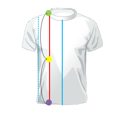 - 中心線(青の実線)と脇腹の線(青の破線)との間(赤線)を確認してください