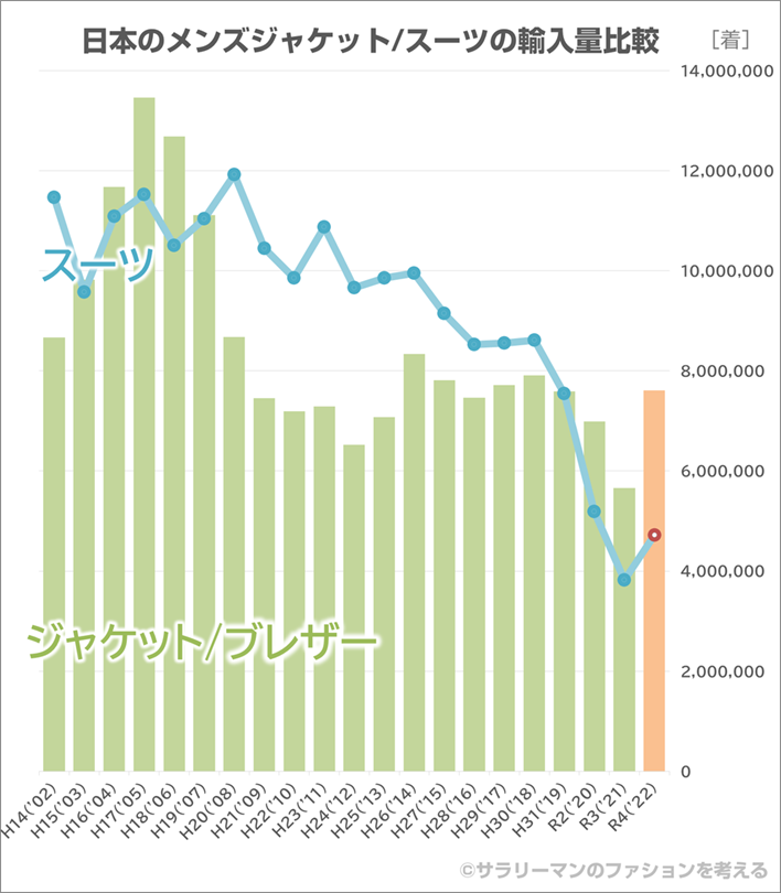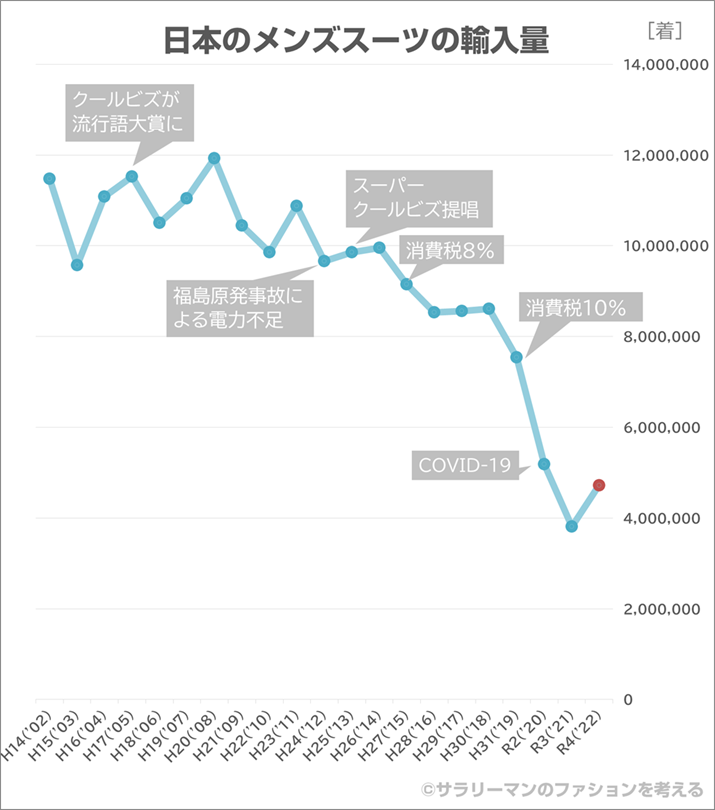 昨年の記事では、20年前の1,200万着/年から、クールビズ、消費増税などを経て800万着を割り込み、コロナ禍で400万着を切るという異常事態になったことをお伝えしました。