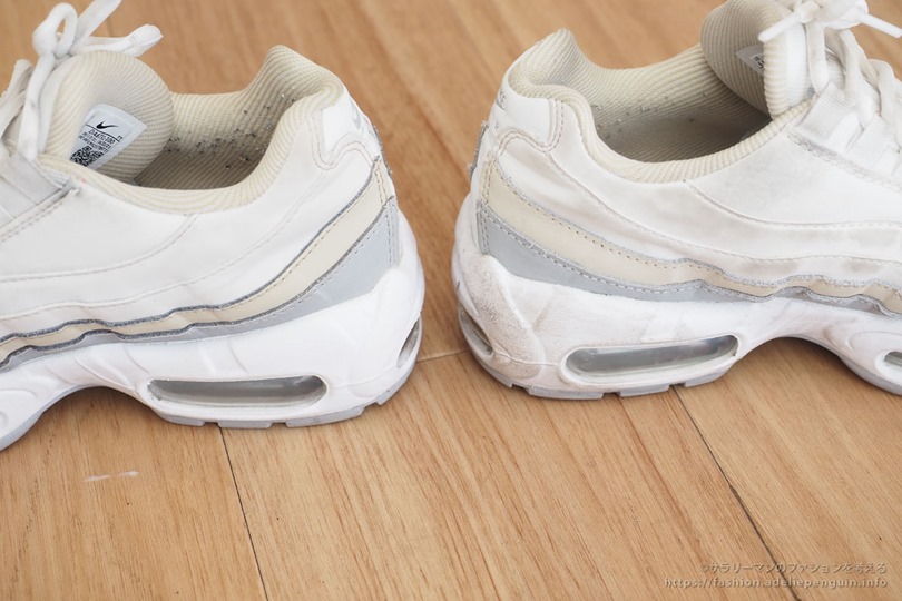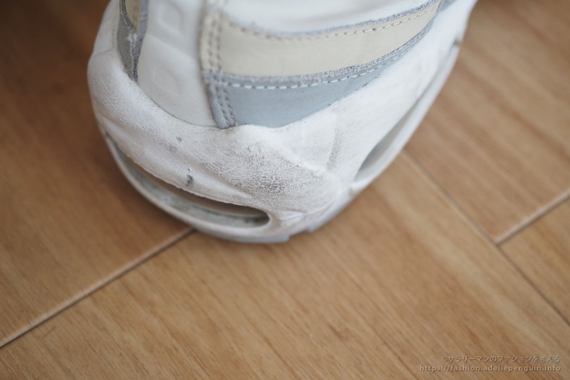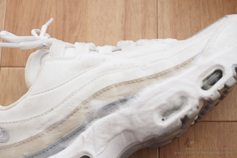 確かに、スニーカーは革靴とは比べものにならないほどタフな環境で履くことの多い靴ですし、実際に大雨に遭ったあともシミになることはほとんどないので、こういう洗い方が適しているのだと思いました。