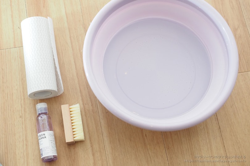 ジェイソンマーク シューケアキット、ぬるま湯を張った洗面器、キッチンペーパーです。