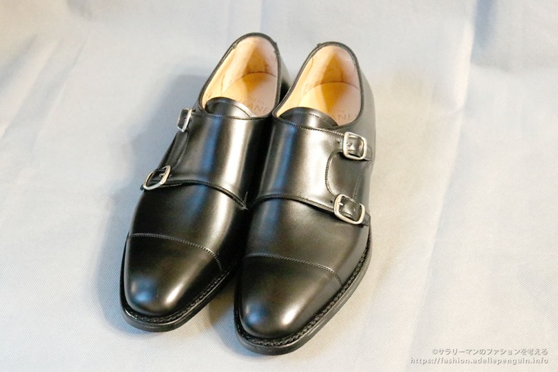 さらに、金曜日は飲み会が予めセットされており、店の雰囲気から靴を脱ぐ可能性が高かったため、水曜日用にスコッチグレインの内羽根の雨用靴(紐靴)を[写真上]、金曜日用に脱ぎ履きがし易いチーニーの雨用ダブルモンクストラップ[写真下]を用意しておきます。