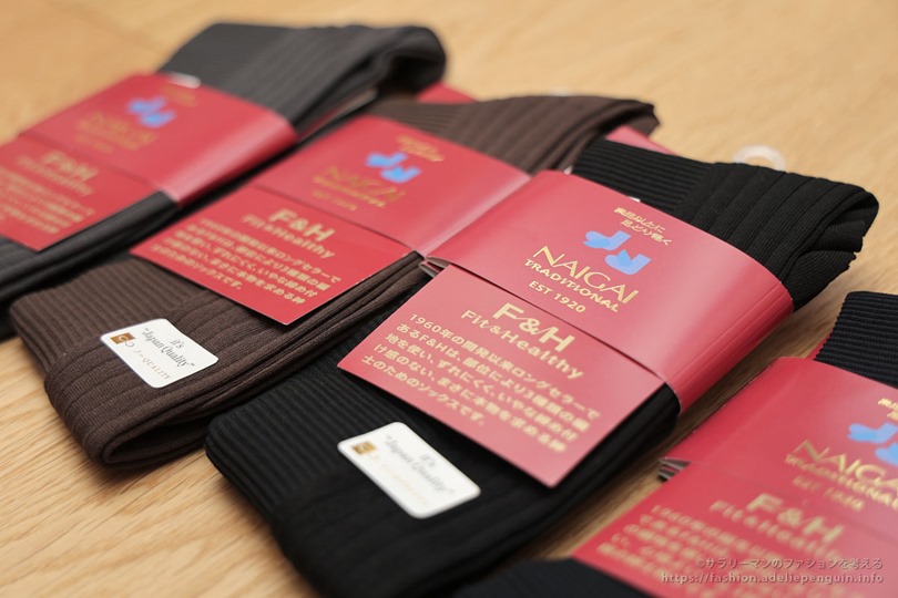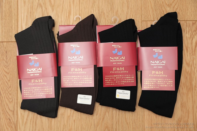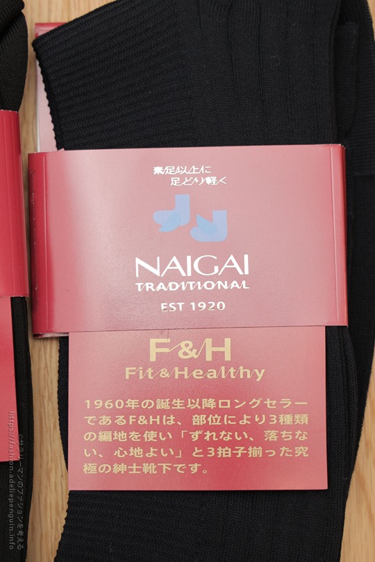 Traditional F&H ロングホーズ(以下F&H)は、今回購入した綿混に加え、秋冬向けの毛混、カシミア混との3種類があるようです。(秋冬向け製品は、公式だと在庫切れなので、今の時期は実質1種類。)