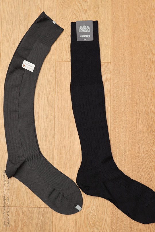 当サイトでこれまで第一選択のロングホーズとしてオススメしてきた、ハリソンのワイドリブロングホーズと並べてみます。