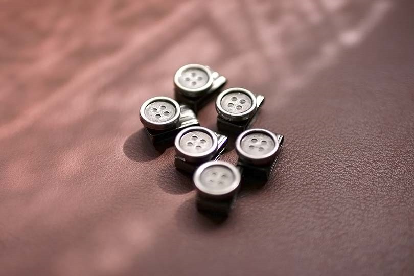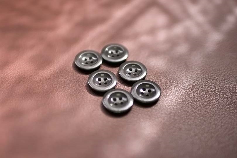 一般のボタンに比べ、少し扁平です。これを、太めの糸をつかい、ズボンの内側6カ所に縫い付けます。