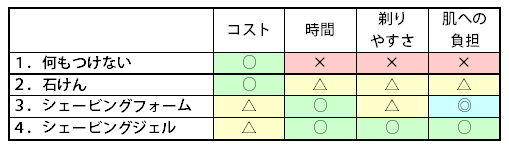 ○: 比較的手軽、シェーバーの滑りがよい、ある程度深ぞりできる