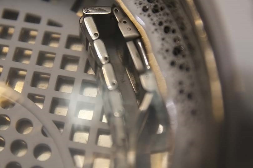 金属バンドをアクセサリー用洗浄皿にのせたうえで、これに沈めます。