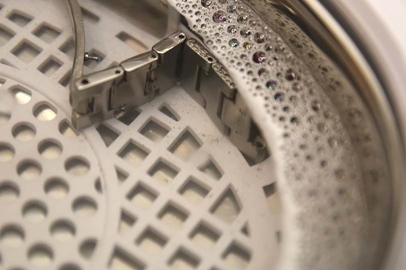 超音波洗浄器は、水中の衝撃波で汚れを落とす仕組み。