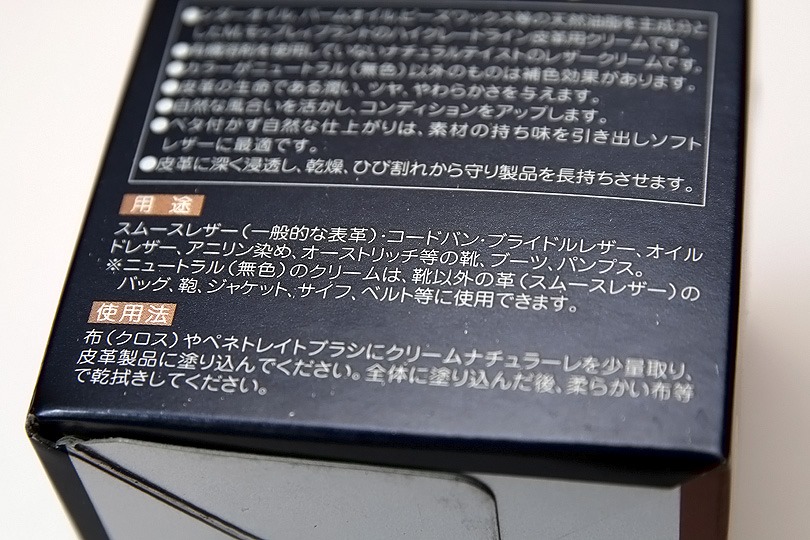 有機溶剤を使用していないナチュラルテイストのレザークリームです。」との記載。