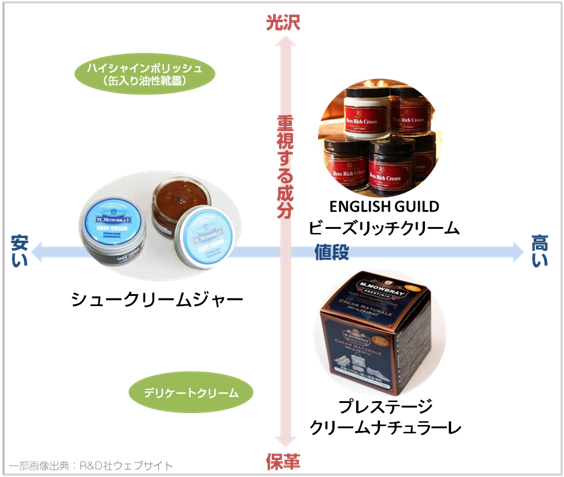 一般的な油性靴墨(主に缶入り)はロウ分によるつや出しと油脂による保革がメインなのに対し、